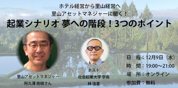 自分らしく社会貢献するキャリアをつくるビジネススクール 「社会起業大学」(https://socialvalue.jp/)( 住所: 東京都新宿区、代表取締役:林 浩喜)は、2020年12月9日(水)19:00より、里山アセットマネジャーの阿久澤剛樹(あくざわ ごうき)氏をお招きしてオンライン特別セミナーを開催いたします。