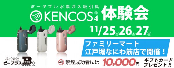 株式会社ビープラスが販売代理店を務める株式会社アクアバンクの『ポータブル水素ガス吸引具KENCOS4(ケンコスフォー)』の無料体験会を「FamilyMart江戸堀なにわ筋店」にて、2020年11月25日(水)~27日(金)の期間に開催いたします。