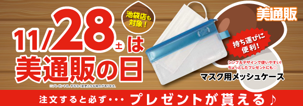 次回の「美通販の日」は2020年11月28日(土)。プレゼントアイテムは、「マスク用メッシュケース」。シンプルなデザインで使いやすく、ちょっとしたプレゼントなどにも最適。マスクを持ち運ぶ際に便利で清潔なマスク携帯用ケースをプレゼントいたします。大変お得な日ですので、この機会にたくさんの方々にご利用いただければと考えております。