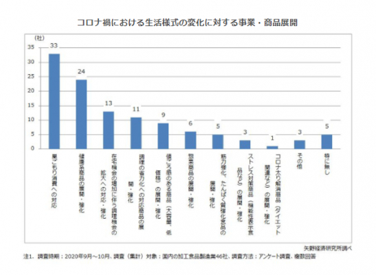 各社に対して、「コロナ禍における生活様式の変化に対応する事業・商品展開として今後どのように取り組んでいくか」を尋ねたところ、「巣ごもり消費への対応」が33社(71.7%)と最も多く、「健康系商品の展開・強化」24社(52.2%)とともに過半数を越え、次いで「在宅機会の増加に伴う調理機会の拡大への対応・強化」が13社(28.3%)、「調理の省力化への対応商品の展開・強化」が11社(23.9%)、「値ごろ感のある商品(大容量、低価格)の展開・強化」が9社(19.6%)と続いた。