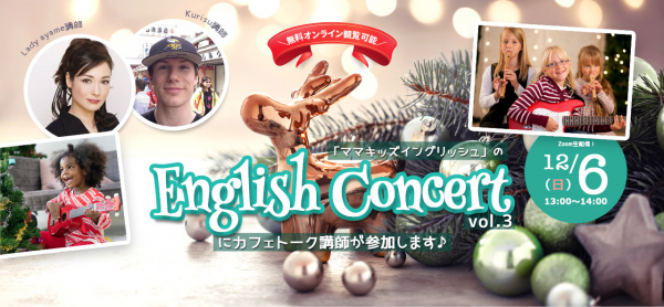 世界中の講師と生徒をつなぐオンライン習い事サイト「カフェトーク(http://cafetalk.com/)」を運営する株式会社スモールブリッジ(本社:東京都渋谷区、代表取締役:橋爪小太郎)は、ママキッズイングリッシュが2020年12月6日オンラインで主催するZoomイベント「第三回English Concert」にコラボ参加いたします。