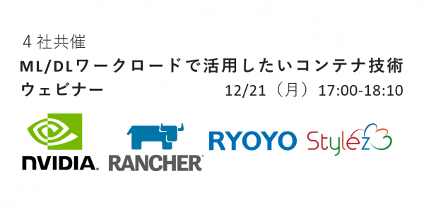 2020年12月21日(月)、株式会社スタイルズ(本社:東京都千代田区、代表取締役:梶原 稔尚 以下、スタイルズ)は、エヌビディア合同会社、、Rancher Labs INC.、菱洋エレクトロ株式会社と協力し、機械学習やディープラーニングの開発や運用業務におけるコンテナ技術の活用のためのセミナー(Webinar)を「ML/DLワークロードで活用したいコンテナ技術 (第1回) - Kubernetes, Rancher, NVIDIA まで-」と題して開催いたします。