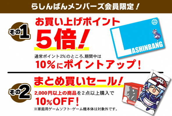 ・単品2,000円以上の商品を2点以上購入で10%OFF(家庭用ゲームソフト・ゲーム機本体は対象外)