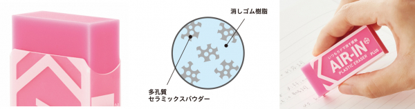 多孔質セラミックスパウダーが無数のカドを生み出し、“いつもカドで消すような軽い消し心地”を実現。オリジナルの樹脂配合により、鮮やかな色と高い消字性能を両立しています。