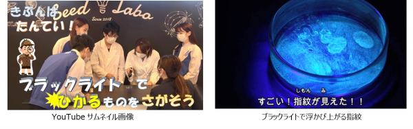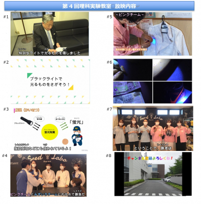 第4回目は、今までの理科実験教室とは異なり、シード鴻巣研究所(埼玉県鴻巣市)に隣接する「ふくろうの森保育園」に隠された光るものを、ブラックライトを使ってチーム対抗戦で探します。ブラックライトは蛍光物質などに反応して、普段見えない光をみることができる特殊なライトです。特別ゲストとして当社代表取締役社長の浦壁が出演したり、保育園の風景などを撮影することで、見ている方が飽きないように工夫した動画となっています。