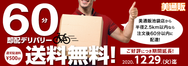 美通販池袋店から半径2.5km圏内なら、ご注文受付から60分以内に商品を配達いたします。