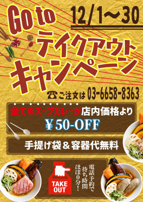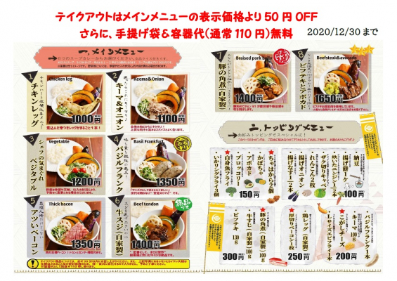 キャンペーン内容:テイクアウトの場合のみ全てのスープカレーが店内価格より50円OFF。さらに、通常手提げ袋と容器代として一品に付110円頂きますがそれも無料となります。