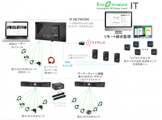 ・拡張性:最大4式のカメラ/最大2式の外付けセンサポッドの接続と1式のラックアクセスコントロールの接続により、最大16式のセンサと2式のラックドアアクセスコントロール/47式のワイヤレスセンサ *オプション含む