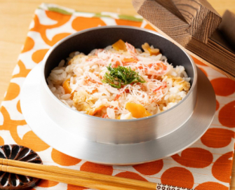 今回境港産の紅ずわいがにを贅沢に使用し、炊き込みご飯に仕上げました。具材は紅ずわいがにの他に人参と油揚げをシンプルに混ぜ込み、京風だしで炊き上げてあります。紅ずわいがにと京風のだしが絶妙に混ざりあって風味豊かな炊き込みご飯に仕上がっています。