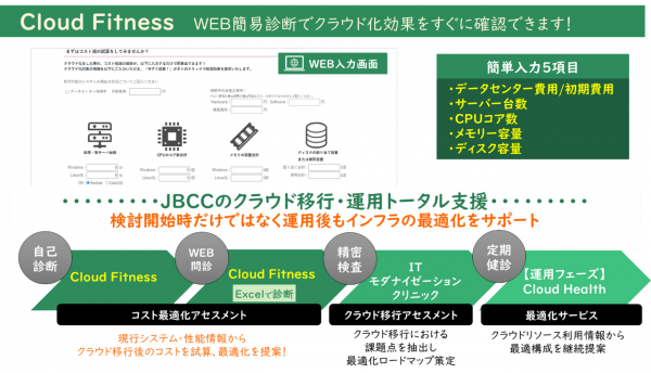 総合ITサービス業のJBCC株式会社(本社:東京都大田区、社長:東上 征司、以下JBCC)は、利用中のサーバーの構成及びコスト情報を、お客様自身が Webページに入力することで、クラウドへ移行した場合のコスト削減効果を測定が可能な 「Cloud Fitness」サービスを12月2日より開始いたします。