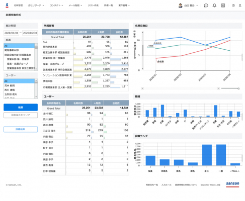 「Sansan」に取り込んだ名刺についてユーザー別(所有者別)、企業別で視覚的に営業活動を確認可能に