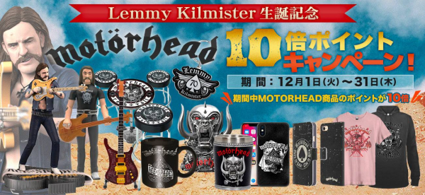日本最大のRock & Entertainment公式Tシャツ・グッズ・ストア【PGS】を運営する株式会社JAMSHOPPING(本社:東京都渋谷区代表取締役:遠藤祐一)は、MOTORHEADのフロントマンLemmy Kilmisterが2020年12月24日で75回目の生誕日を記念して、12月1日(火)~31日(木)までの期間中、最新商品を含むMOTORHEAD公式商品をお買い上げいただくと10倍ポイント・バックのキャンペーンを実施いたします。