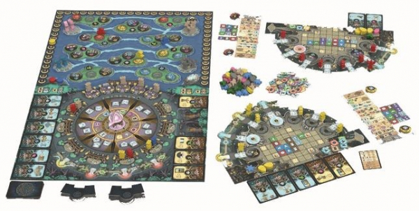 ●内容物/ゲームボード1枚・プレイヤーボード4枚・アクションサマリー4枚・出発地点タイル4枚・拡張部タイル4枚・任務66枚・アクションタイル72枚・ポータル28枚・道タイル28枚・カウントダウンタイル5枚・運命タイル32枚・捧げ物タイル40枚・篝火1つ・0/50点マーカー4枚・ノームカード33枚・サマリーカード4枚・ソロプレイ用カード8枚・守護者駒20個・見習い駒33個・資源駒57個・船駒4個・得点マーカー4枚・ルールブック1冊