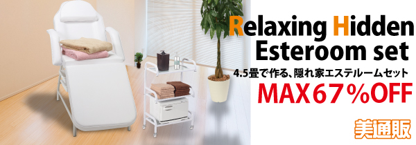 プロ向け美容材料の通信販売サイト「美通販」(https://www.bitsuhan.com)では、間取りの一部でつくれる「4.5畳で作る隠れ家エステルームセット」キャンペーンを開催中です。商品は最大67%OFFでお買い求めいただけます。