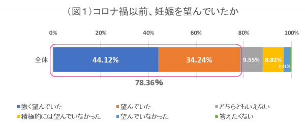 そこで被験者(n=3,697)に対して、コロナ以前、お子さんの妊娠を希望されていたかを聞いた。その結果、「(強く)望んでいた」と回答したのは78.36%に上った(図1)。