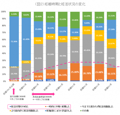 8割近くの被験者が妊娠を望んでいたにも関わらず、妊婦のうち2割前後は、外出自粛要請期間(2020年4月~5月)以降、妊活を取りやめたり、一時的に中断・延期をしていたことがわかる(図2;横軸は調査時点での妊娠月齢)。
