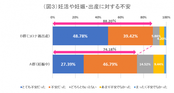 ・2020年2月以降に出産されたママ(B群)は88.20%がコロナ禍での出産に不安を感じていたが、妊婦(A群)は74.18%と14.02pt低かった。