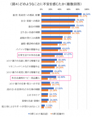 次に、前問で「(とても)不安だった」と回答した被験者(n=2,848)に、どのようなことに不安を感じたかを聞いた。いずれの回答においても、コロナ禍で出産したママたち(B群)よりも妊婦(A群)の方が少ないという結果になった(図4)。