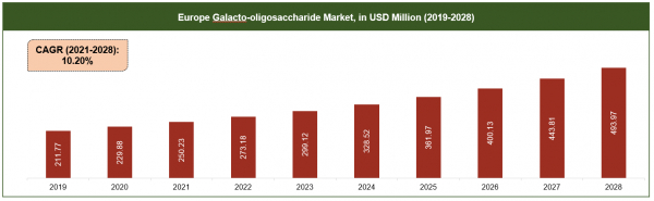 ● 2019年、世界のガラクトオリゴ糖市場は 483.93 百万米ドルの市場価値を占め、2021-2028年の予測期間中に10.15%のCAGRで成長すると予想されています。