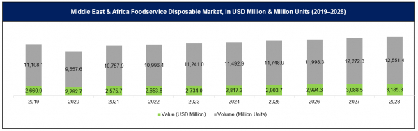 2019年、世界のフードサービス使い捨て市場は59,130.0百万米ドルを占め、2020-2028年の予測期間中に6.84%のCAGRで成長することにより、2028年までに88,481.5百万米ドルに達すると推定されています。