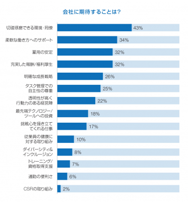 会社員の多くが会社に求めることとして「切磋琢磨できる同僚」(43%)を挙げました。コロナ禍でのテレワークを経て、イノベーションなどの新しい発想や競争力の向上には上司・同僚など関わりが重要であることを改めて認識したとも考えられます。テレワーク・時差出勤など「柔軟な働き方への要求」(34%)が急速に高まった反面、これまで転職時に重要視するポイントとして常に上位に着けていた「通勤の便利さ」を求めているのは会社員全体のわずか6%に留まりました。次点には「雇用の安定」、「報酬・福利厚生の充実」(ともに32%)が着けました。この結果は、先々の見通しが立ちづらい経済とビジネス環境への不安から、生活の安定を重視する会社員が増えていることも示唆します。