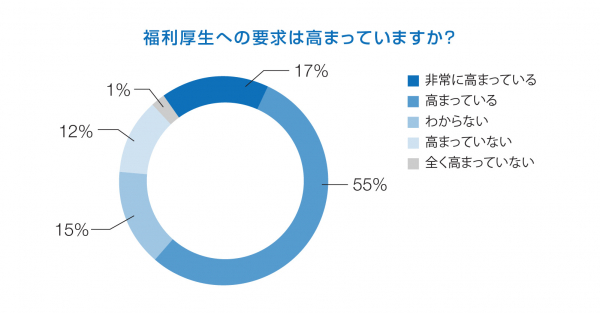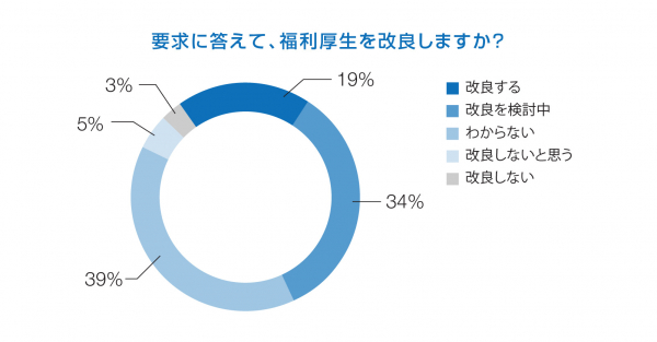 300社の回答からは、コロナ禍を経て従業員からの福利厚生への要求が高まっていることもわかりました。「要求が高まっている」と答えた72%の企業のうち、半数以上(53%)が早速「福利厚生の改良」を進めている、または検討しています。そのほかの企業が挙げた「改良を進めていない理由」では、「業界水準を満たしているから」(41%)、「予算がない」(23%)、「経営陣が現状維持を求めている」(22%)が上位を占めました。