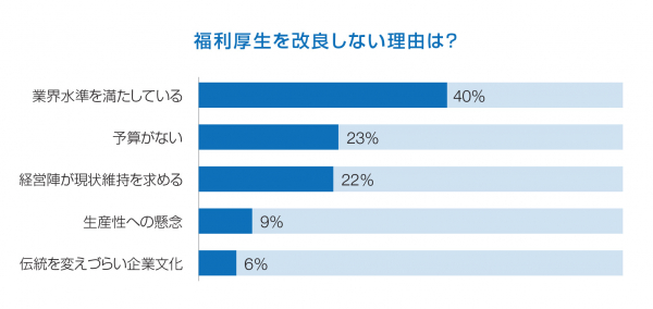 [企業] 福利厚生の改良を進めない理由:上位に「業界内の足並み」、「予算不足」、「経営陣の現状維持思考」