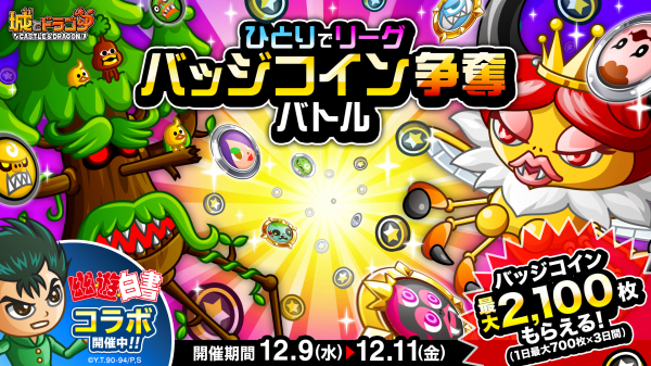 株式会社アソビズム(本社:東京都千代田区、代表取締役:大手智之)は、App Store・Google Playにて好評配信中の『城とドラゴン』で、2020年12月9日(水)より「ひとりでリーグバッジコイン争奪バトル」を開催いたします。