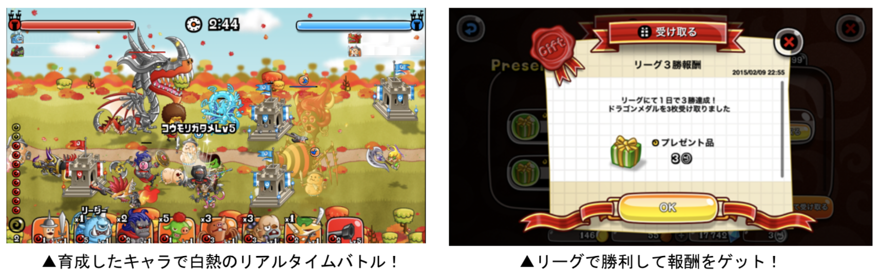 「リーグ」終了後には、ランキング順位に応じて“ドラゴンメダル”や“きびだんご”が、そして各バトルにおいても勝利すると“ルビー”などの報酬が手に入ります。