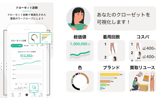 クローゼット診断機能では、着用回数が多い・少ないアイテム、手持ち服のコスパ、色分析、ブランド分析、着ていないアイテムを使ったコーデ提案などの機能が搭載されています。SDGsの認知拡大により「サステナブル」への意識が浸透してきている今、手持ち服を有効活用したいというユーザーの要望が多くなっています。診断・リユース機能を搭載することで「サステナブルなクローゼット」として手持ち服の有効活用を提案します。