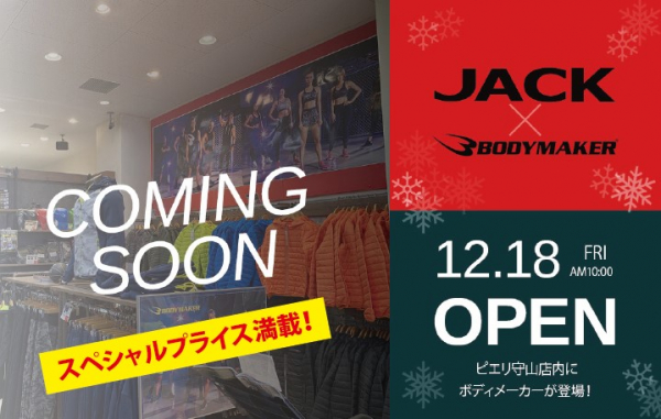 JACKピエリ店内にBODYMAKER選りすぐりのアイテムが並ぶことで、お客様に商品を直接手にとって感じていただいたり、またスポーツを満喫していただく事が可能になります。スポーツや健康への関心が日々高まってくる中、新しくスポーツというカテゴリーで展開します。またオープン記念として、人気商品を目玉価格で大放出します。ぜひ、JACKピエリ守山店へのご来店をお待ちいたしております。