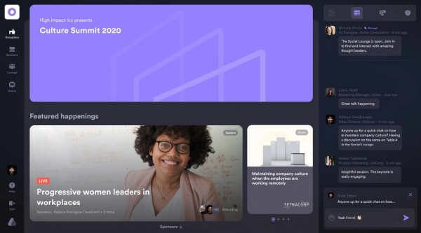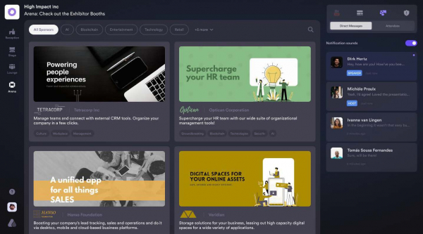 企業のPRに最適なバーチャルブースエリアとなるアリーナでは、企業ロゴやブランディング機能を使用して多彩なカスタマイズをしたり、各ブースのラウンジで参加者と交流したりすることもできます。