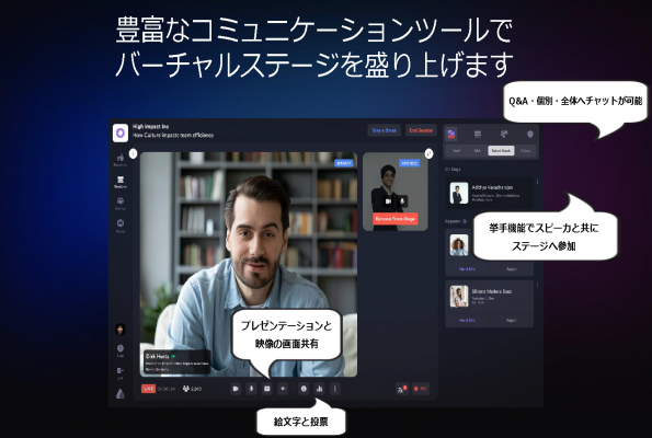 またチャットやQ&Aの機能を使えば、顔や声を出したくない場合でも意思表示ができます。バーチャル会場のステージでゲストが登場して話すようなトークイベントの場合、イベント開催中に投票を行ったり、手を挙げてオンライン通話で質疑応答をしたりすることも可能です。