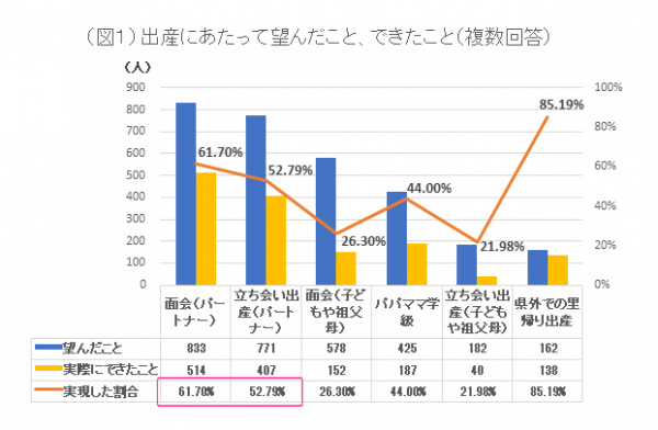 ・出産時に希望することのうち、パートナーの面会を実現できたのは61.70%、パートナーの立ち合い出産を実現できたのは52.79%。