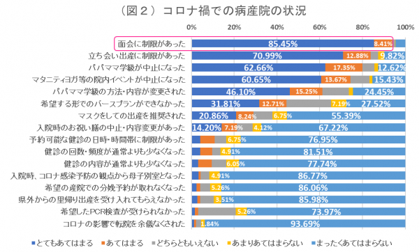 その結果、「面会に制限があった」のは93.86%にも上り、病産院としても、未知のウイルスから赤ちゃんを守るために厳しい対応していたことがわかる(図2)。また、「立ち合い出産に制限があった」のも83.87%となっており、こちらも同様に厳しい対応がとられていた。