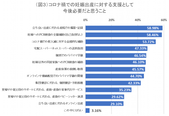 ・「コロナ禍での妊娠出産に対する支援として今後必要だと思うこと」として、最も多かったのは、「立ち合い出産に代わる産院での撮影・記録」(58.98%)。