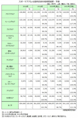また、近年はスポーツ用品メーカーとしても旧品との違いを打ち出せる新たなアイテムの提案が進んでおらず、過去モデルと類似の新作投入が多くなっている。似たような新品と旧品が店頭に並んだ場合、低価格の旧品を購入する消費者が多い。こうした傾向も踏まえ、2021年の春夏シーズンは持ち越された旧品処分を最優先にして、新たに提案する品番数や品番ごとの投入数量を減らすというメーカーも多い。こうした要因から、2021年のスポーツアパレル国内出荷金額は2020年を上回るものの、「コロナ前」の2019年の水準にまでは戻らないものと予測する。