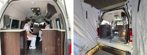 JapanCRCのキャンピングカーは100V電源が使用できる他、エンジンを停止した状態でも稼働できる暖房機「FFヒーター」が標準で搭載されているなど、車両単体で医療施設としての代用が可能となります。導入から運用まで時間を要さず、病院側の事情や天候に応じて素早く移動できる利点もあるため、受け入れ先の検査体制や車両の配置ロケーションに応じた運用が可能です。