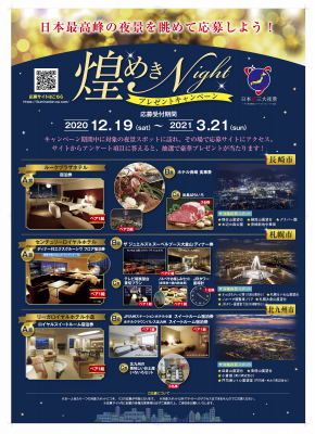 この度、一般社団法人 夜景観光コンベンション・ビューローでは、2020年12月19日(土)~2021年3月21日(日)の約3ヶ月にわたり、「日本新三大夜景都市」の共同キャンペーン『煌めきNightプレゼントキャンペーン』を実施いたします。本キャンペーンは、コロナ感染症拡大の影響により移動制限がなされ、近隣にお住いの方が地元の魅力を見直すきっかけを作っていただくことを目的としているものです。