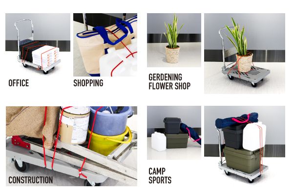 「大切な荷物をしっかり固定して運搬する」という当たり前だけど今までなかった製品で、ゴム紐と台車本体で「しっかり固定」できるように両方を一から設計しました。