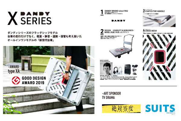 2019グッドデザイン賞を受賞した「DANDY Xシリーズ」の新ラインナップとして小サイズ(150kg)「type XL」が加わります。受賞した大サイズ(300kg)「type XA」の製品特徴である「静音性・軽量化・本体の運搬性」の遺伝子をしっかり引き継ぎながら、小型台車が活躍するシーンでお客様が困る「荷崩れ」を根本解決する機能をさらに追加いたしました。