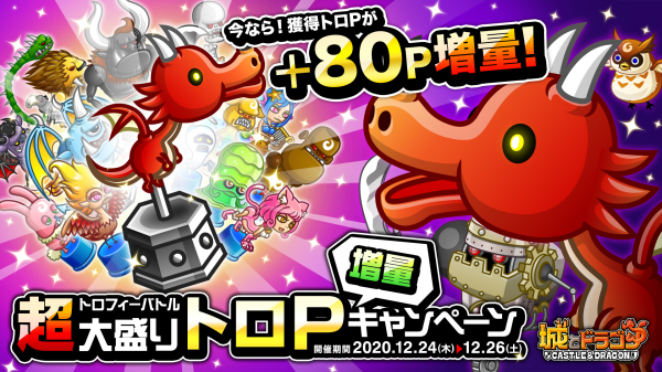 株式会社アソビズム(本社:東京都千代田区、代表取締役:大手智之)は、App Store・Google Playにて好評配信中の『城とドラゴン』で、「トロフィーバトル 超大盛りトロP増量キャンペーン」を2020年12月24日(木)より開催いたします。