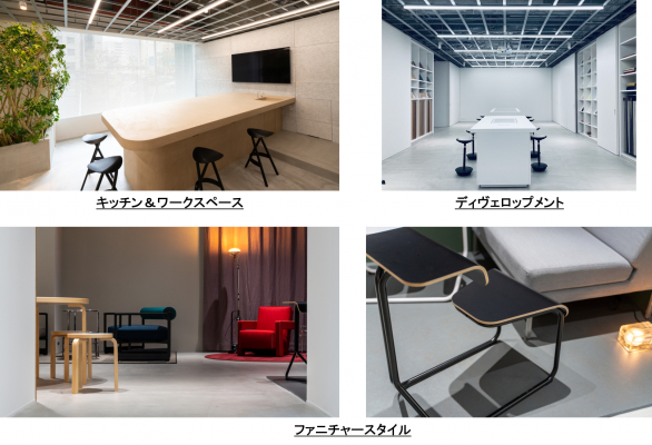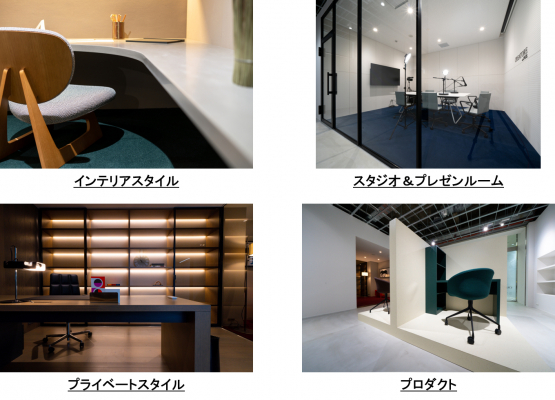 家具や床・壁などの空間素材、インテリアアクセサリーなどの展示はもちろん、それらの組み合わせ実験やVRを使った理想のオフィス空間の仮想体験ができるスペースを備えています。また、さまざまな シーンを想定し、テーマごとに展示。集中やリラックスを生み出す空間や人が集まりコミュニケーションが生まれる空間、在宅勤務のためのリビングの一角をいかしたスペースなど、これからの時代に適した、創造性を高めるワークスペースをご提案します。
