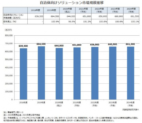 今後、自治体業務のデジタル化やDX(デジタルトランスフォーメーション)の実現、人手不足、働き方改革の機運の高まりなどを背景に、引き続き印刷業務を中心としたBPO(ビジネスプロセスアウトソーシング)サービスの利用は進展するものとみる。また、AI(人工知能)やRPA(Robotic Process Automation)などの新たなITソリューションの利活用などに向けた投資が進むことが期待されるが、市場規模を押し上げるにはまだ時間がかかるものと考える。そのため、2021年度の市場規模は6,518億円(前年度比101.2%)を予測し、以降、2024年度まで市場規模は横ばいで推移するとみる。