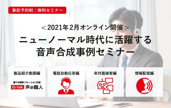 本Webセミナーでは、コロナ禍における新しい生活様式と共に変化したビジネスシーンにおいて、音声合成技術がどのような貢献ができるか、具体的な事例とともにご紹介いたします。お気軽にご参加ください。