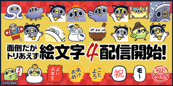 株式会社インクルーズ(東京都渋谷区、代表取締役社長 山﨑 健司)は、LINE株式会社(東京都新宿区、代表取締役社長 出澤 剛)が運営するコミュニケーションアプリ「LINE」内のショップにて、LINEスタンプ「面倒だがトリあえずミニ」とLINE絵文字「面倒だがトリあえず絵文字4」を2020年12月31日(木)の大晦日に2作品併せての同時配信を予定しております。