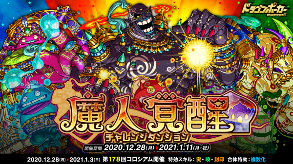 株式会社アソビズム(本社:東京都千代田区、代表取締役:大手智之)は、App Store・Google Playにて好評配信中のリアルタイム合体カードバトル『ドラゴンポーカー』で、2020年12月28日(月)より復刻チャレンジダンジョン「魔人覚醒」を開催いたします。