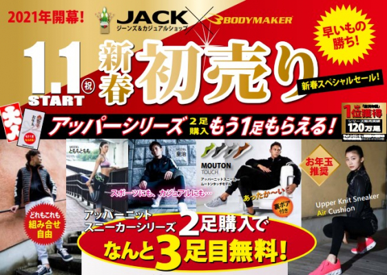 ジーンズカジュアルショップ「JACK」店内の「BODYMAKER SHOP」では、2021年1月1日より新春初売りセールを開催いたします。テレビCMでおなじみの、「格闘技から生まれたスニーカー」アッパーニットスニーカーシリーズは¥1,000(税別)で販売。2足購入で3足目無料キャンペーンを実施します。他にもお買い得品が目白押し。ぜひ、JACK店内BODYMAKER SHOPへのご来店をお待ちいたしております。