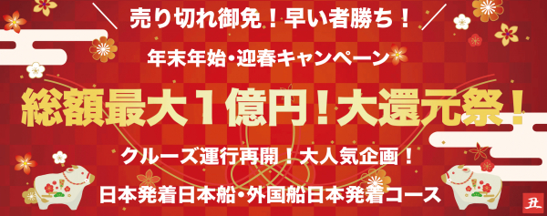 コロナ禍ではございますが、例年通り、年末年始・迎春キャンペーンを開催いたします。「総額最大1億円」と過去最大級の大還元です。期間限定且つ先着順となりますので、お早目のご検討、ご予約をお願いします。誰よりもお得にクルーズ旅行を楽しみましょう!