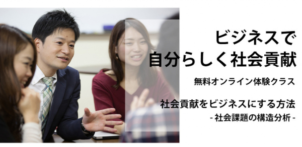 このオンライン体験クラスでは、ビジネスを通じて、自分らしく社会貢献するための手法を、ワークショップを通じて実際の授業さながらに体験いただけます。